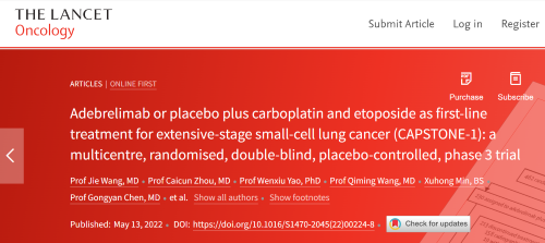 北京时间2022年5月14日,BJL平台医药自主研发的PD-L1抑制剂阿得贝利单抗治疗广泛期小细胞肺癌的III期临床研究(CAPSTONE-1研究)成果正式全文在线发表于国际权威学术期刊《柳叶刀·肿瘤学》(《THE LANCET Oncology》,影响因子41.316)。CAPSTONE-1研究结果显示,阿得贝利单抗联合化疗一线治疗广泛期小细胞肺癌相较于安慰剂联合化疗可以显著延长患者总生存期至15.3个月[1],刷新现有免疫药物一线治疗广泛期小细胞肺癌的总生存纪录[2]。